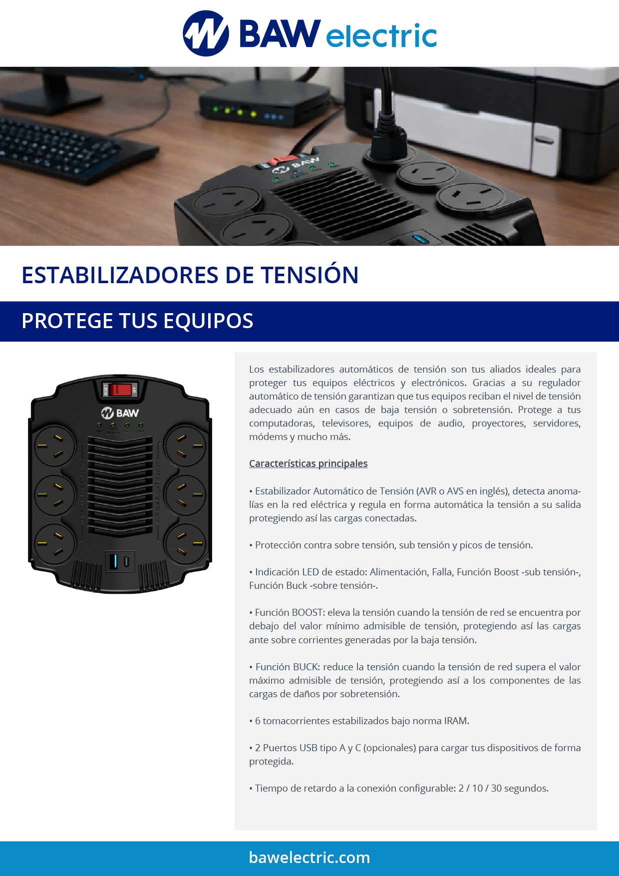 ET61000U2Y1El Estabilizador de Tensión Automático 2000VA / 1000W con USB BAW ET61000U2Y1 regula automáticamente la tensión eléctrica en instalaciones monofásicas de 220 V, protegiendo equipos frente a variaciones de la red. Incorpora sistema de Regulación Automática de Tensión (AVR/AVS) con funciones Boost y Buck, manteniendo la salida en 220 V ±10 %.