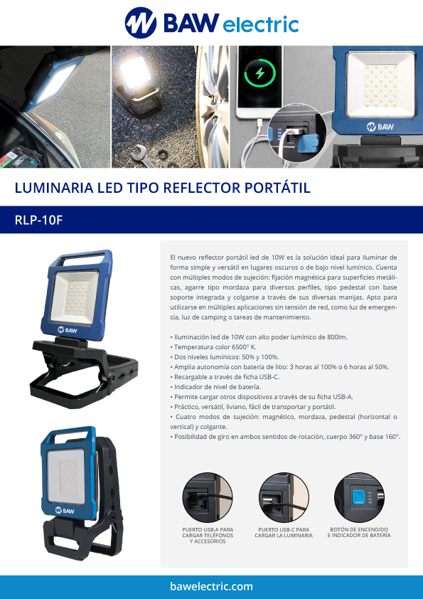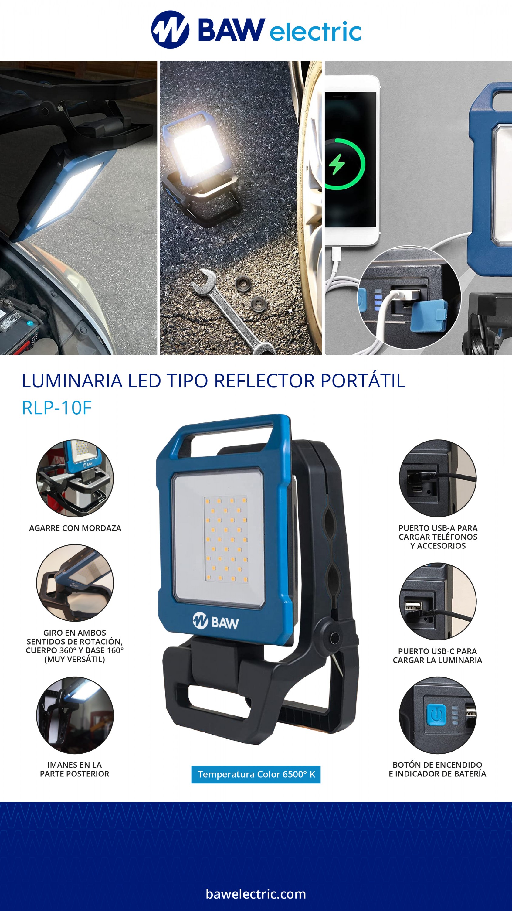 El Reflector LED portátil recargable BAW RLP-10F 10W (4471) es una solución práctica para iluminación en situaciones donde no se dispone de conexión eléctrica o se requiere movilidad.